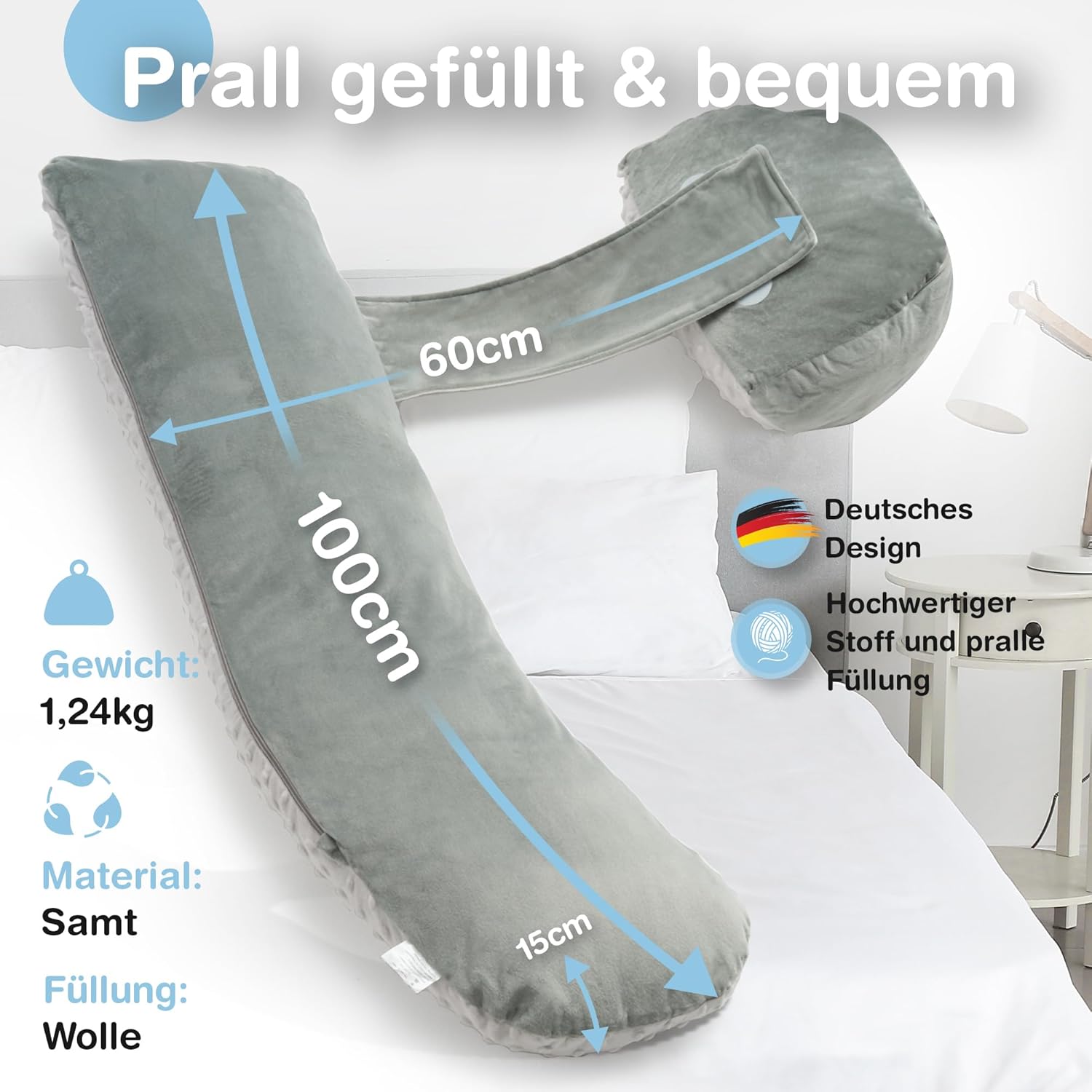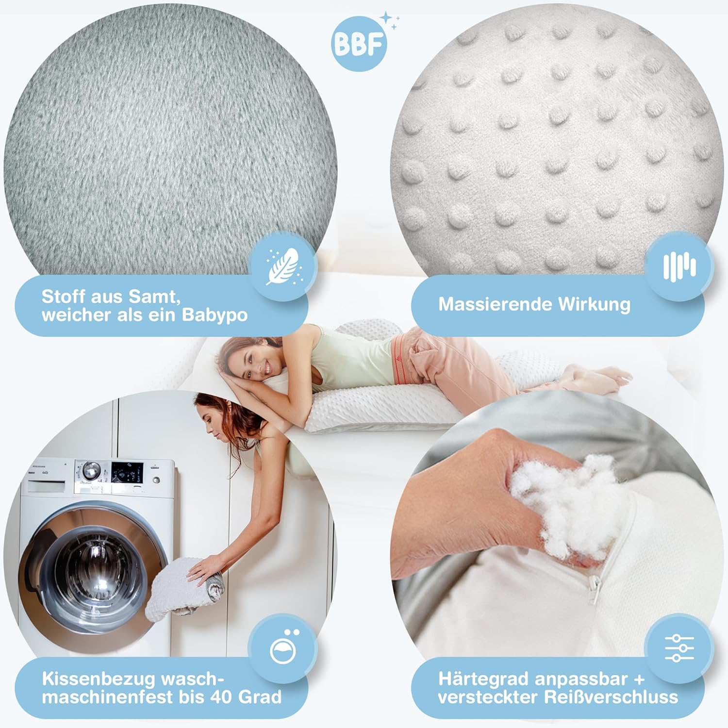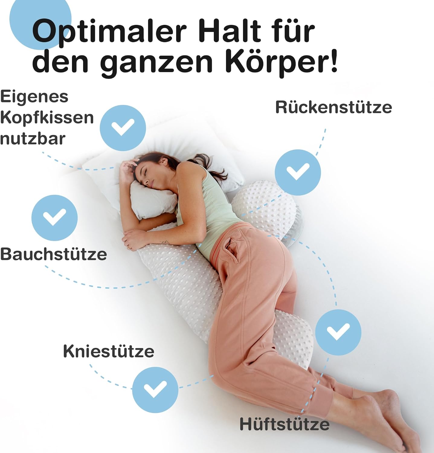 Durch die spezielle Form des Kissens schmiegt sich das Kissen an deinen gesamten Körper und gibt dir die Entlastung die du brauchst.