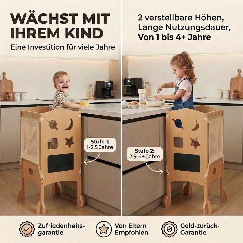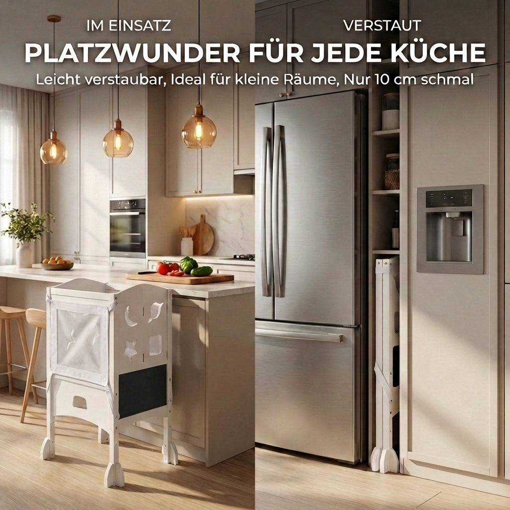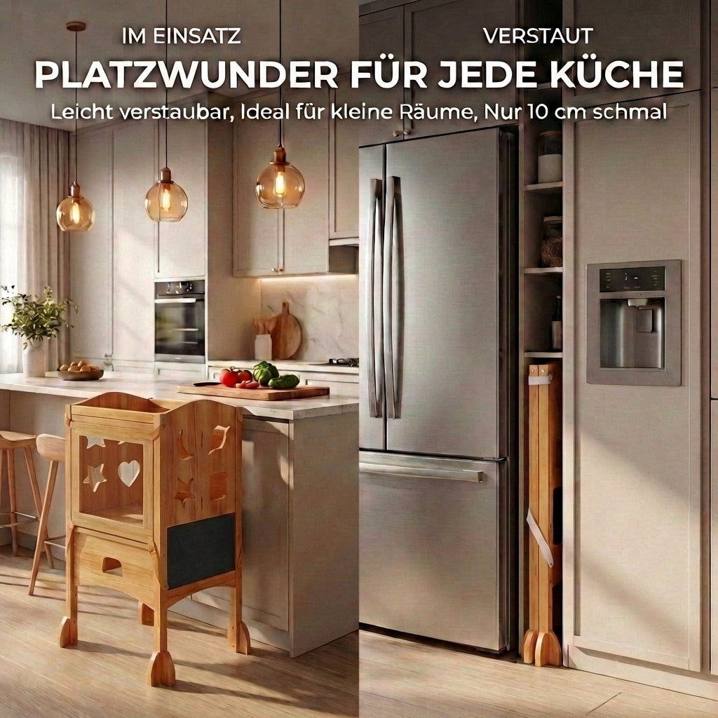 Die Höhe des Lernturms ist passend für jede Standard Küchenzeile. Platzprobleme gibt es keine, dank der Klappfunktion.