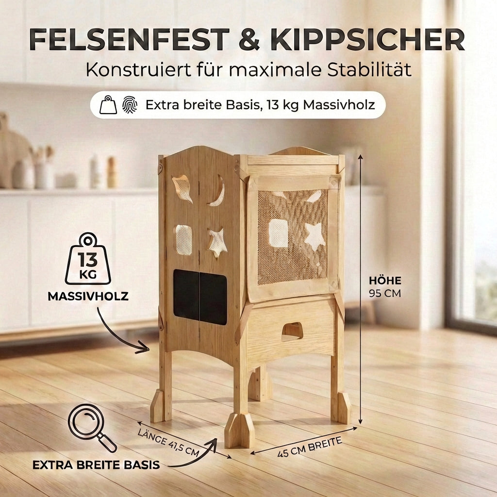 Durch das Gewicht und die zusätzlich angebrachten Anti-Kipp-Füße besteht keine Gefahr, dass der Lernturm umkippt.